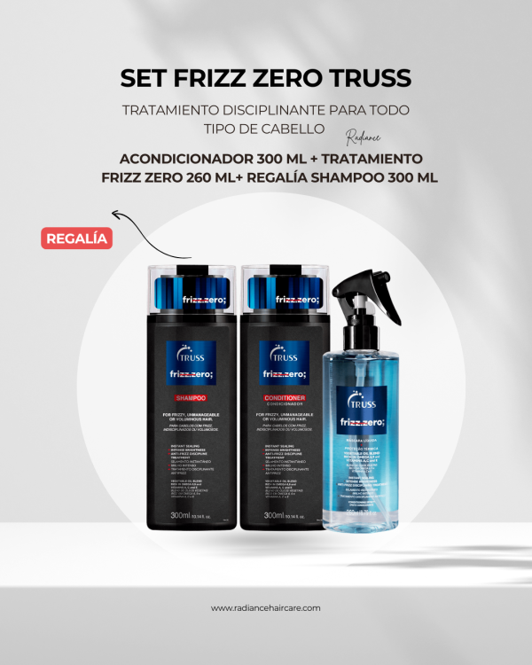 â— Potente fórmula con Mezcla de Aceites Vegetales, además de ser rica en Omegas 6 y 9 y Vitaminas A, C y E. Sus resultados se pueden notar desde la primera aplicación y se potencian al combinar el champú con el uso de los demás productos de la línea TRUSS FRIZZ ZERO.